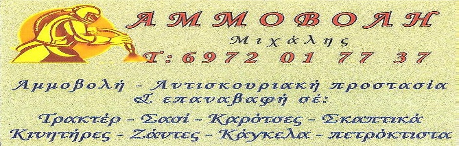 ΑΝΑΛΑΜΒΑΝΟΥΜΕ ΑΜΜΟΒΟΛΗ ΑΝΤΙΣΚΟΥΡΙΑΚΗ ΠΡΟΣΤΑΣΙΑ ΚΑΙ ΕΠΑΝΑΒΑΦΗ ΣΕ: ΤΡΑΚΤΕΡ - ΣΑΣΙ - ΚΑΡΟΤΣΕΣ - ΣΚΑΠΤΙΚΑ - ΚΙΝΗΤΗΡΕΣ - ΖΑΝΤΕΣ - ΚΑΓΚΕΛΑ - ΠΕΤΡΟΚΤΙΣΤΑ